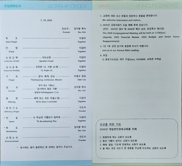 날짜: 2026.01.12 글쓴이 : 박귀성 | 특별예배 Special Service